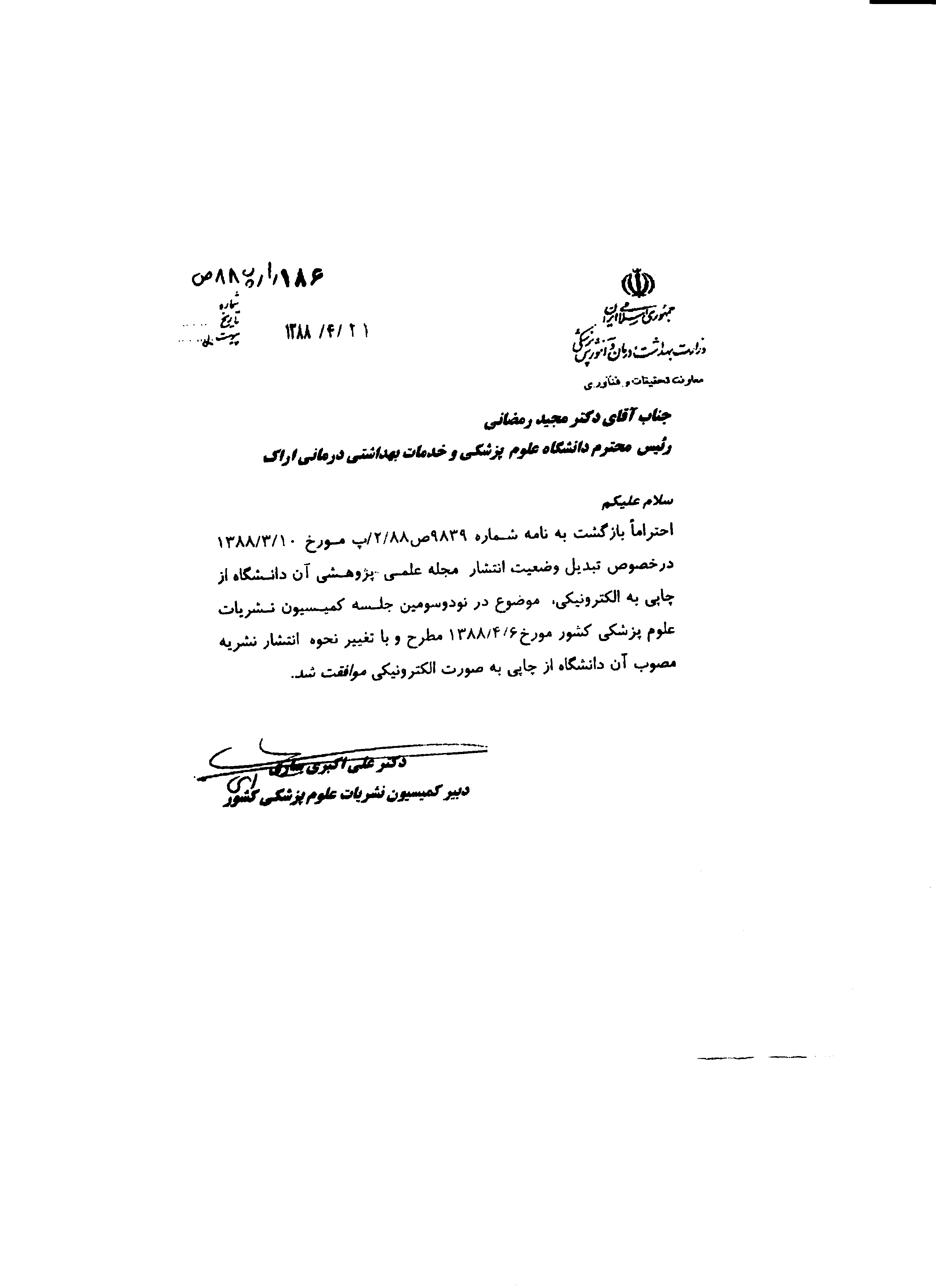 الکترونیکی انتشار. مجوز انتشار الکترونیکی. مجله دانشگاه علوم پزشكي اراك. 1388; 12 (3)
