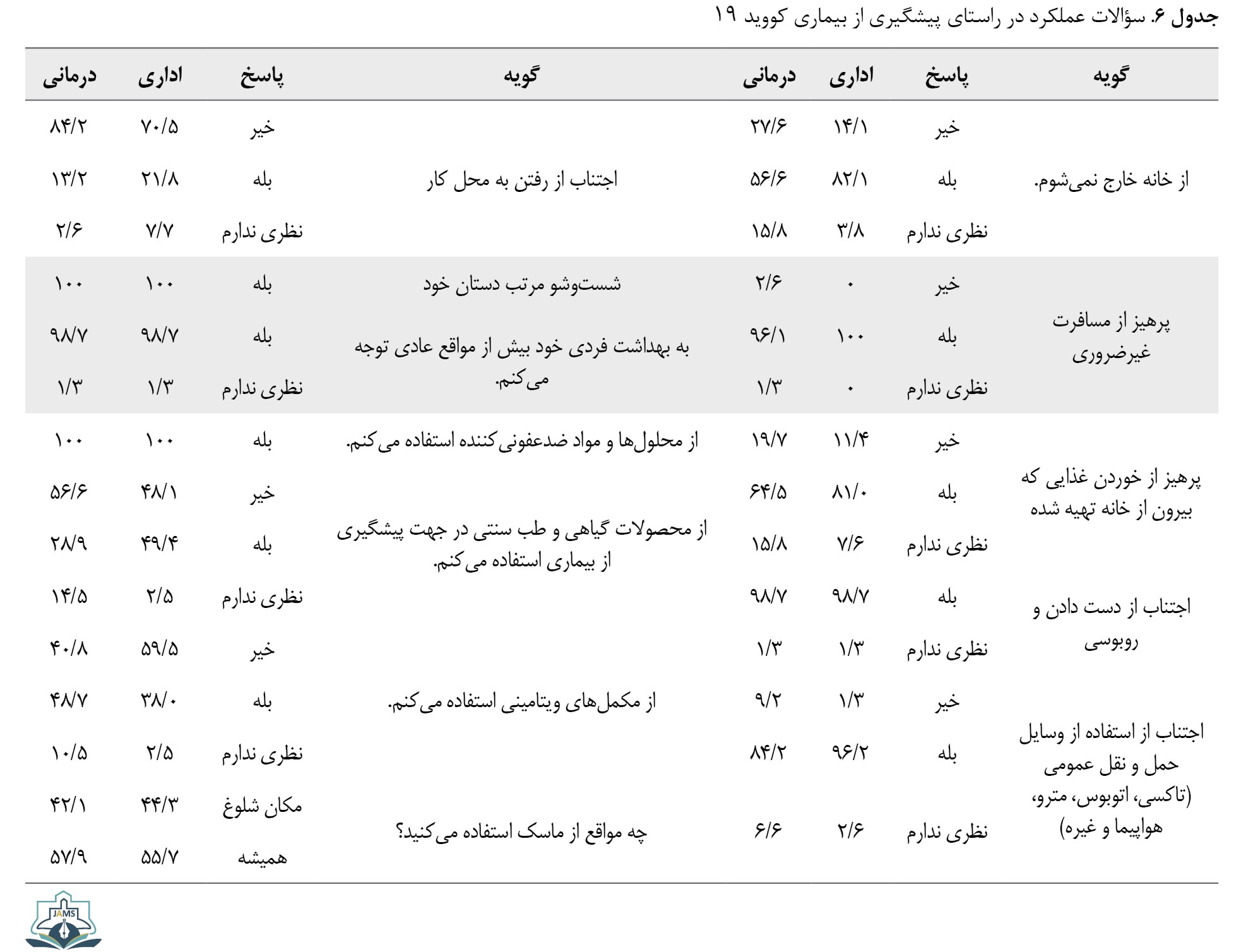 طبق نتایج حاصل، اقدامات اکثر افراد حاضر در تحقیق به صورت زیر بود:82/1 درصد کادر اداری و 56/6 درصد کادر درمان عدم خروج از خانه، 100 درصد کادر اداری و 96/1 درصد کادر درمان پرهیز از مسافرت غیرضروری، 81 درصد کادر اداری و 64/5 درصد کادر درمان پرهیز از خوردن غذایی که بیرون از خانه تهیه شده، 98/7 درصد هر دو گروه اجتناب از دست دادن و روبوسی، 96/2 درصد کادر اداری و 84/2 درصد کادر درمان اجتناب از استفاده از وسایل حمل و نقل عمومی، 100 درصد هر دو گروه شستوشوی مرتب دستان، 98/7 درصد هر دو گروه توجه بیشتر به بهداشت شخصی و 100 درصد هر دو گروه استفاده از محلولها و مواد ضدعفونیکننده را به عنوان راهکارهای پیشگیری از بیماری بیان کردند.